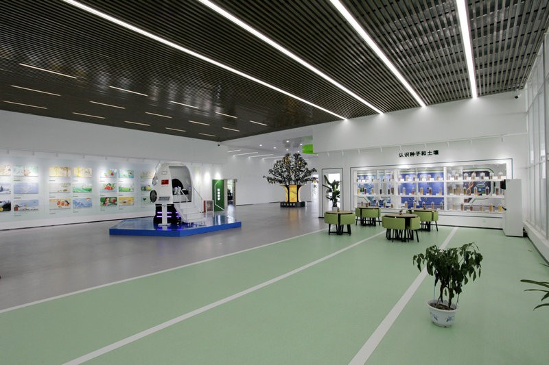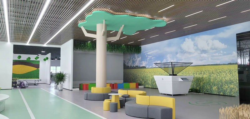 在突出數字農業展廳科技氛圍的基礎上,也要凸顯農業的生態和諧之美。所以,在色彩、形式、功能上合理搭配,用場景還原的方式營造真實的農業場景,讓參觀者身臨其境去體驗。用代表綠色生態的配色來升華成展廳的主色調,用數字展示技術展示農業內容。